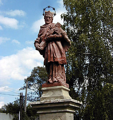Barokní socha sv. Jana Nepomuckého z pískovcového kamene. V současnosti na podstavci stojí kopie sochy, originál sochy byl dlouhé roky uložen v zahradách Akademie výtvarných umění v ateliéru restaurování výtvarných děl.